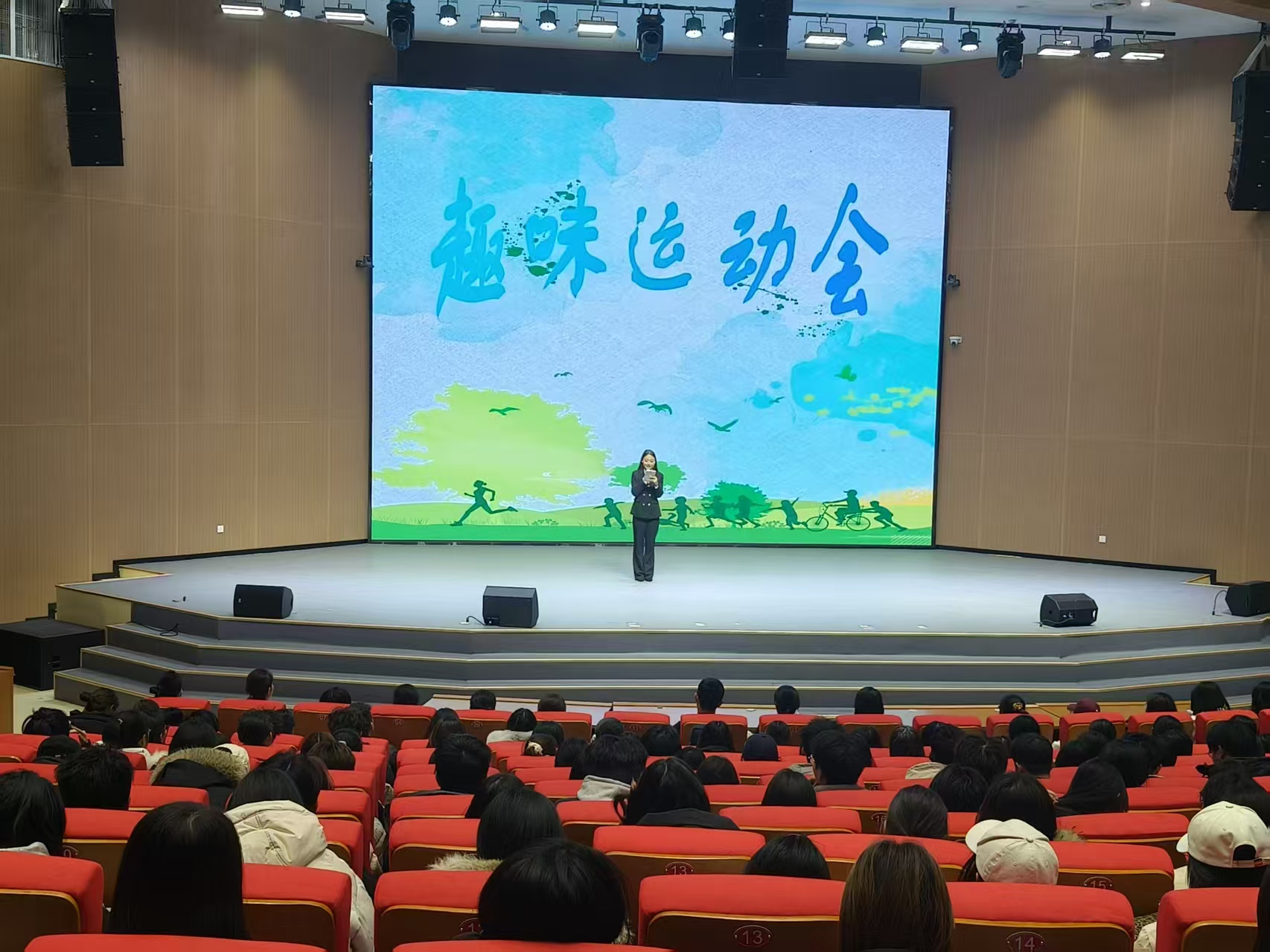 随后主持人逐一介绍了本届运动会的五项团队项目:蒙眼敲锣、摸石头过河、乒乓球接力、呼啦圈穿越与呼吸的力量,并现场播放示范视频、进行动作演示,帮助同学们直观理解规则与技巧。