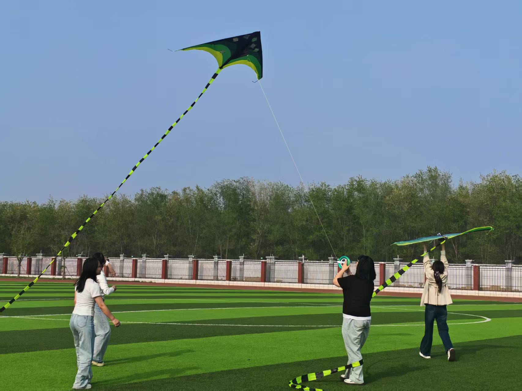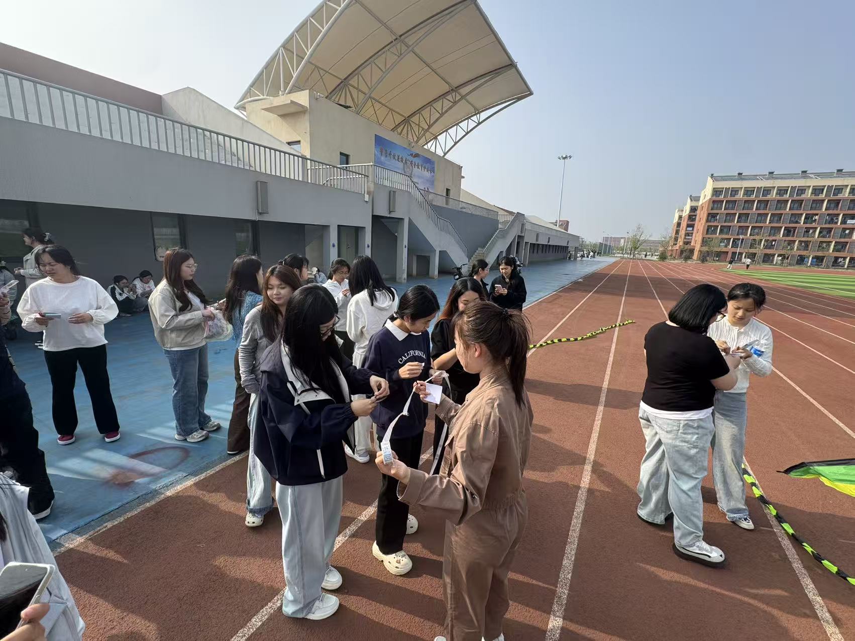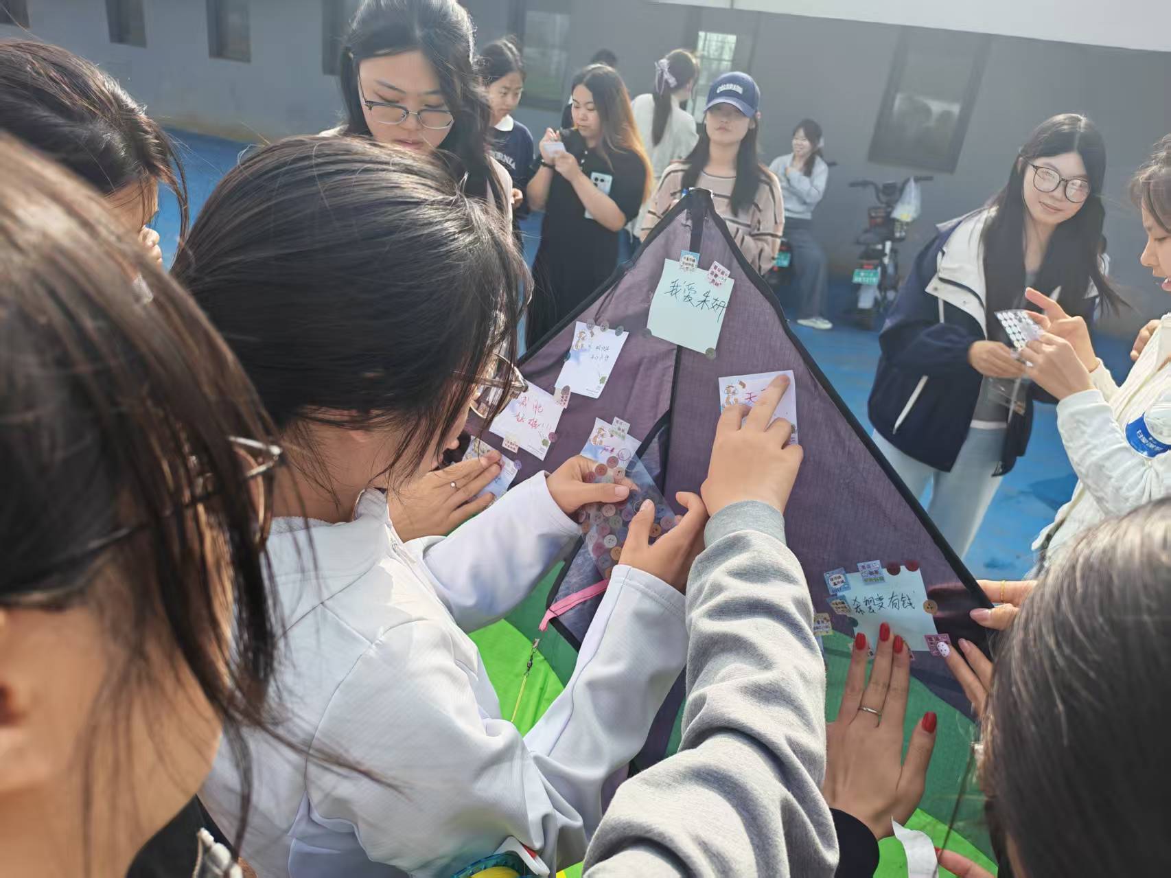 大家以鸢为媒,挣脱书桌前的疲惫与忙碌,在开阔的校园操场之上舒展身心,迎着和煦春风,牵着风筝线肆意奔跑,看着贴满烦恼便签的风筝慢慢升空、越飞越高,仿佛所有的疲惫与焦虑都被春风带走,共赴一场充满青春气息与治愈力量的春日之约。